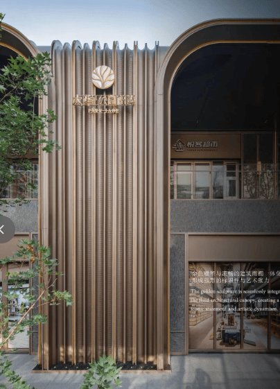 用料上,庭院两侧设计师选用 大理石与镂空铝板虚实结合,利用2层柏翠造型铝线条错拼而成,更显精致;