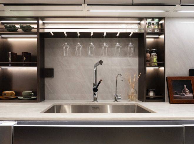 比如说餐边柜+操作台+洗手台一体化设置,让这个空间不再单独的满足于简单的吃饭、客厅休憩。