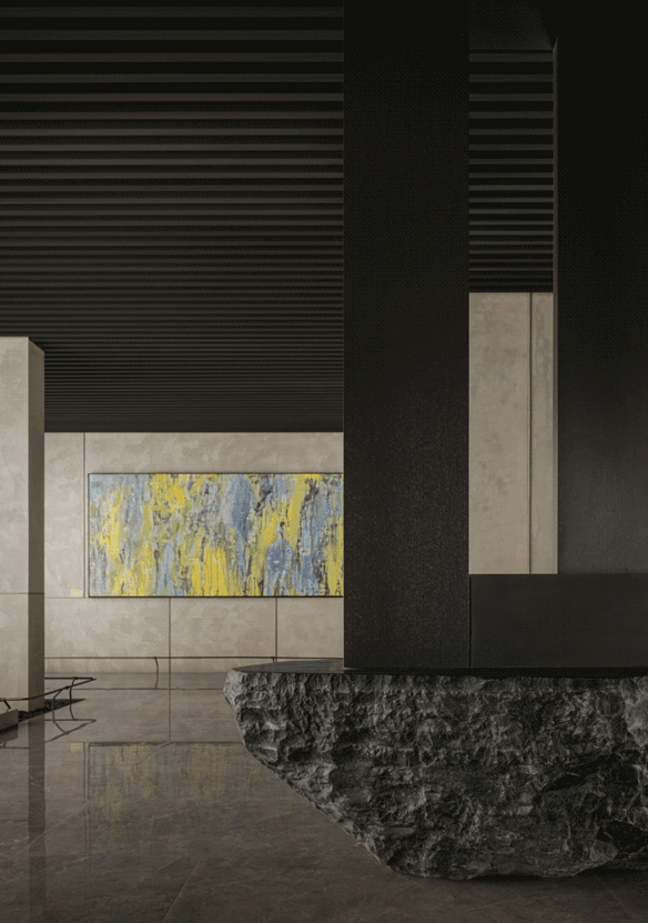 选用黑山石、梵高印象等名贵的石材,于空间内部营造出山水画卷般的意蕴。两侧的接待台处,艺术家运用细腻的白描浪花笔触,将湖景的灵动瞬间定格。