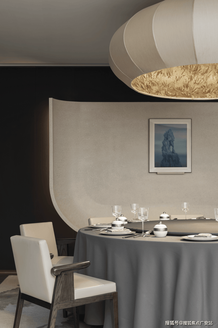 享宴区巧妙地借由墙壁装置精心营造出泛舟湖上的迷人意境,同时加以自然的花艺和山石装置作为辅助,仿佛那浩渺如烟波、广袤无垠的湖景即刻清晰地展现在眼前,让宾客刹那间深深地沉浸在幽远而宁静的氛围里头。恰如满席清风悠悠拂来,使人陶醉于自然之间,造就了一段悠然自在、自然惬意的隐逸时光。