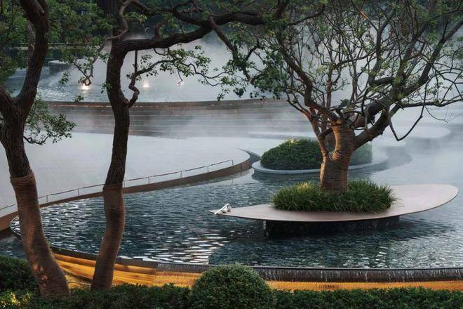 首先,大华公园柏翠利用12级叠水、2座树池、9步水上汀步,运用六重造景的手法打造近500平的中央水景!