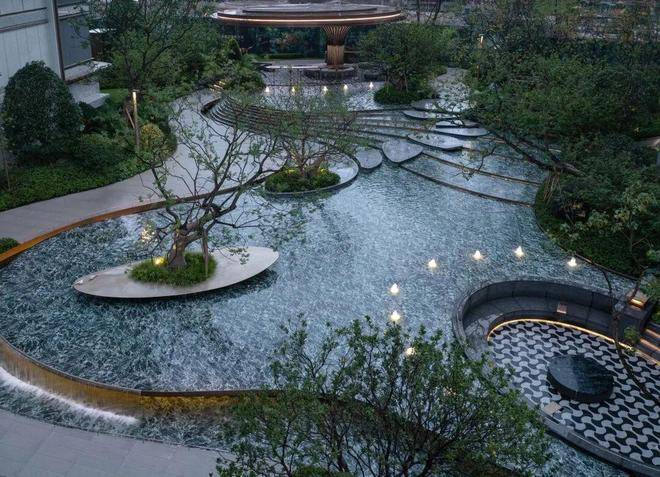 并且将中心场地抬高1米,在水系池底通铺1300多片的PRADA绿石(仿石砖)、精选斜飘乌桕、造型紫薇等名贵树种...