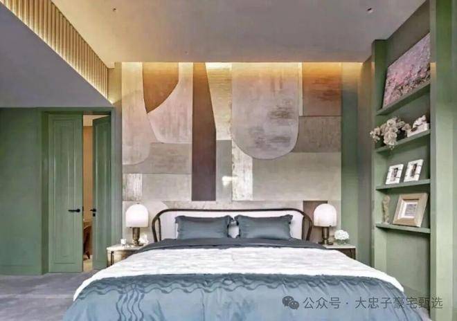 顶层下午茶区以淡绿为底,壁炉暖光漫过手绘地毯的肌理,将社交场域沉淀为冥想容器;主人房墙面缟玛瑙(Onyx)的天然流痕,也与一层屏风暗纹形成时空对位,光影在矿物晶体中生长出私密的诗。