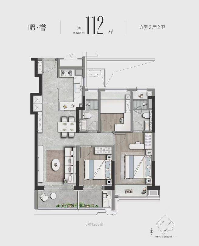 约112/119㎡配备美诺4件套厨电(含油烟机、灶具、蒸烤一体机、洗碗机)、大金中央空调+地暖+霍尼韦尔新风系统三大件,并搭载华为全屋智能控制系统。