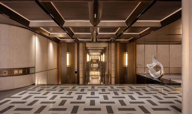 地下光厅同样采用了海派轻奢风格打造,金属背景墙、岩板墙面、水磨石地面及铝板+发光云石吊顶,营造出酒店式归家感。