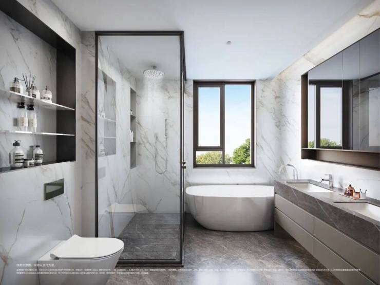 第二,3间套房的设计能满足各个家庭成员的隐私。尤其是主卧,尺度超大,并配置了双台盆+浴缸+淋浴+马桶豪华四件套,还有超大步入式衣帽间。