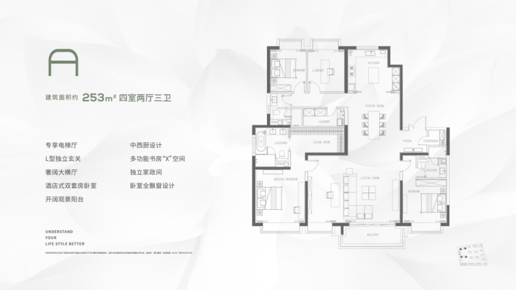 建面约253㎡的户型有几个重点: