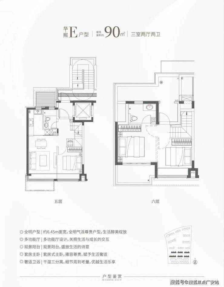 主力户型建面约90-133㎡,特别是这个E户型,建面仅约90㎡,对于想住叠加但预算有限的购房者来说,面宽约6.45米,上下动静分离带,是个不错的选择!
