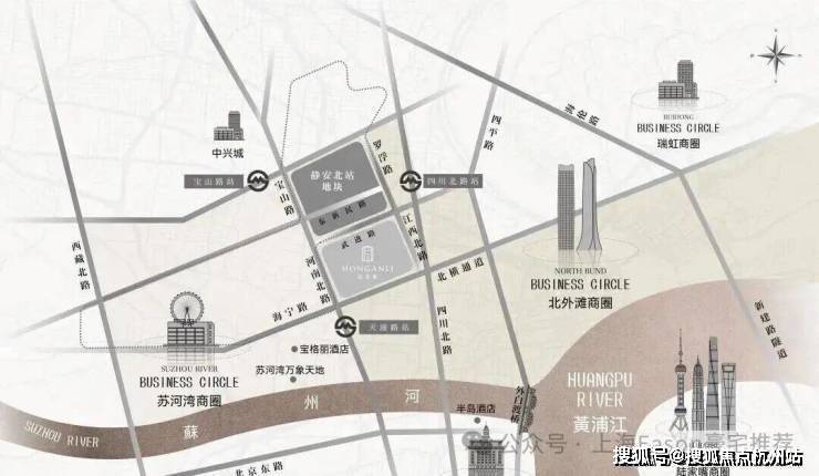 仅从图上看,该地块直线距苏州河约1公里,直线距外滩约1.4公里,直线距北外滩约1.7公里,直线距3/4号线宝山路站约300米,直线距10号线四川北路站约560米,区位优势明显。
