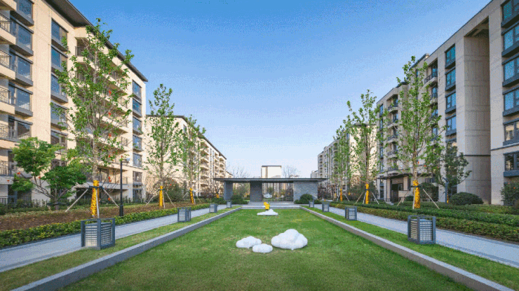 社区内部,视野随着迎宾大道、仪式景墙、约200米景观中轴等景观节点的动线变化,而变换不同的风景。