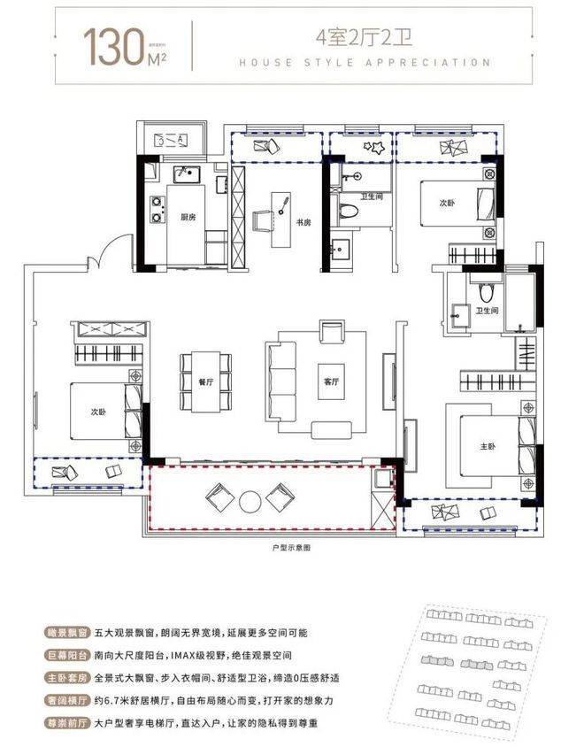 3+1房两厅两卫,约5.4米宽景大阳台、双明卫全能设计、套房式星级主卧以及令人震撼的北侧功能区全飘窗覆盖,整个室内所呈现的阔绰感,再加上高赠送空间,足以媲美市面上140㎡左右的大户型。
