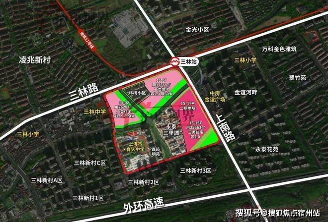 该地块为三林镇金光村“城中村”改造的重点项目,紧邻地铁11号线三林站,规划一条12米宽公共步行通道,连接社区与地铁站;同时周边有中房金谊广场、三林中学、东方医院等生活配套。