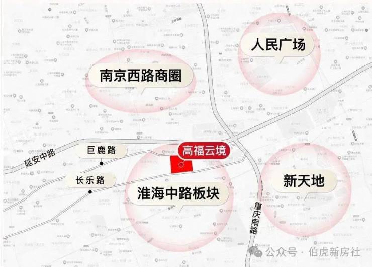 在具体位置上,高福云境位于 上海百年核心商业区淮海中路商圈,北临巨鹿路,南临长乐路,正是无数 上海人心目中的白月光“巨富长”街区。