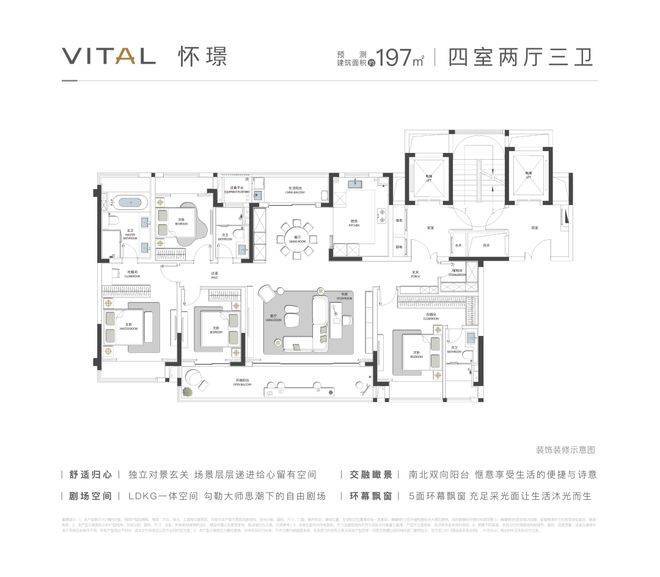 要三卫有,要三明卫有,要横厅有,要竖厅有,要玄关有,要储藏室有,要南阳台有,要北阳台可以有,飘窗也必须都给你配齐了;这就是拾月璟庭的197平户型。