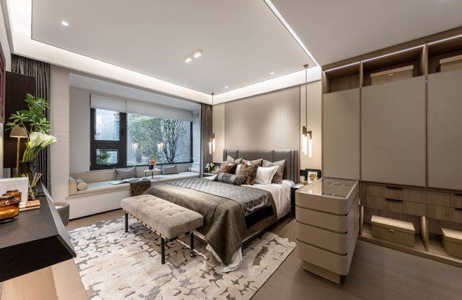 主卫的逼格(双台盆、淋浴房浴缸配齐)拉满,主卧主卫转角飘窗将主卧室的视野和采光提升到了极致。