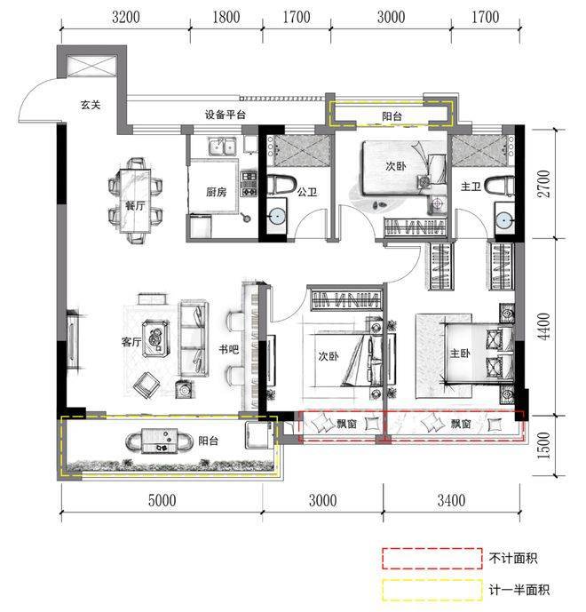 另一款建面约108㎡边套户型改善感更加明显,三开间朝南的设计,面宽接近约11.4米。