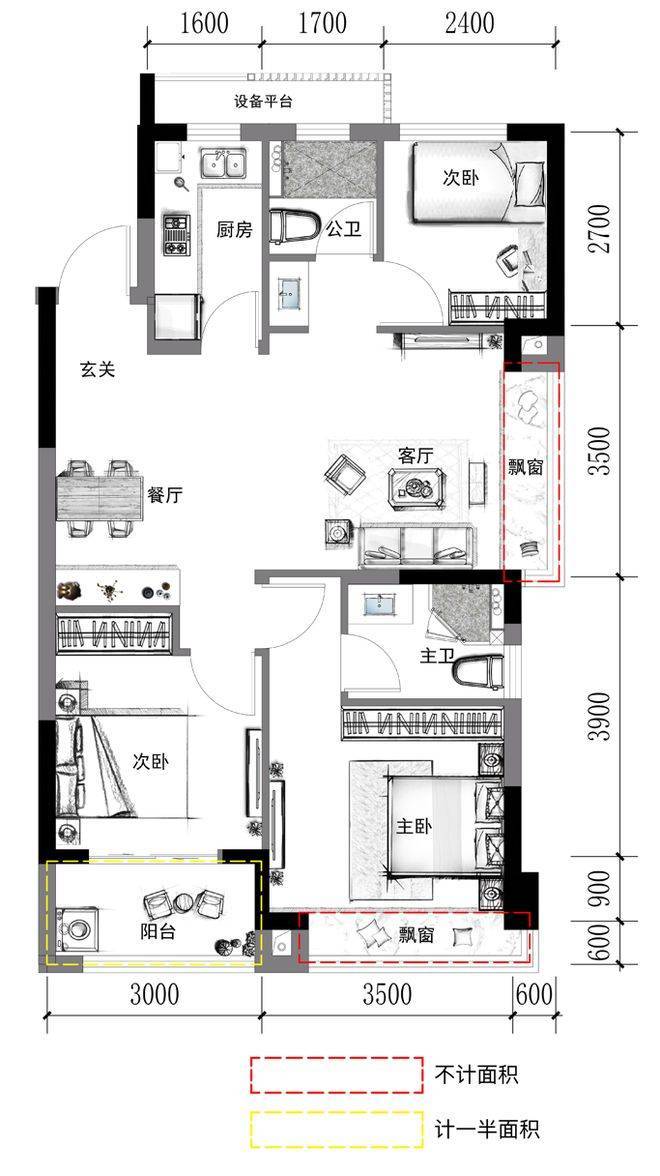 主卧、次卧南置,连通全面宽飘窗或阳台,足以享受充沛阳光。