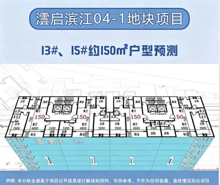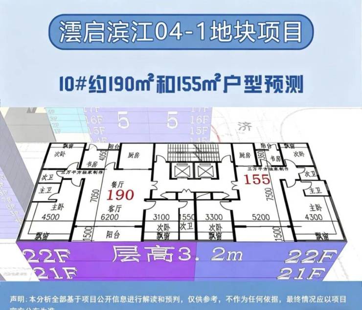 在户型分布上,新地块遵循景观资源最大化原则,将三栋住宅朝向东北偏转约45度,以最大化利用江景视野。面积方面,经过三万平方的预测统计,高层户型面积约150-360㎡,分别为150㎡、155㎡、190㎡、235㎡、250㎡、295㎡以及360㎡,层高约3.1-3.6米;具体信息以开发商最终公示为准。