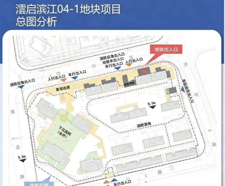 项目共设三个人行出入口、两个车行出入口及两个消防应急入口。主要出入口位于地块北侧的德州路,南侧耀川路同时设置一处人行及一处车行出入口。东侧济明路设有非机动车出入口。此外,值得注意的是,地块东北侧沿街面设置了规划中的地铁19号线德州路站出入口,业主可通过景观连廊便捷出行。