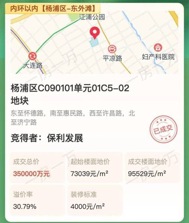 2025年6月上海5批次土拍中,6大国央企经过95轮激烈竞价,最终由保利发展以总价35亿元、楼板价95530元/㎡摘得杨浦东外滩64街坊地块(01C5-02地块)。