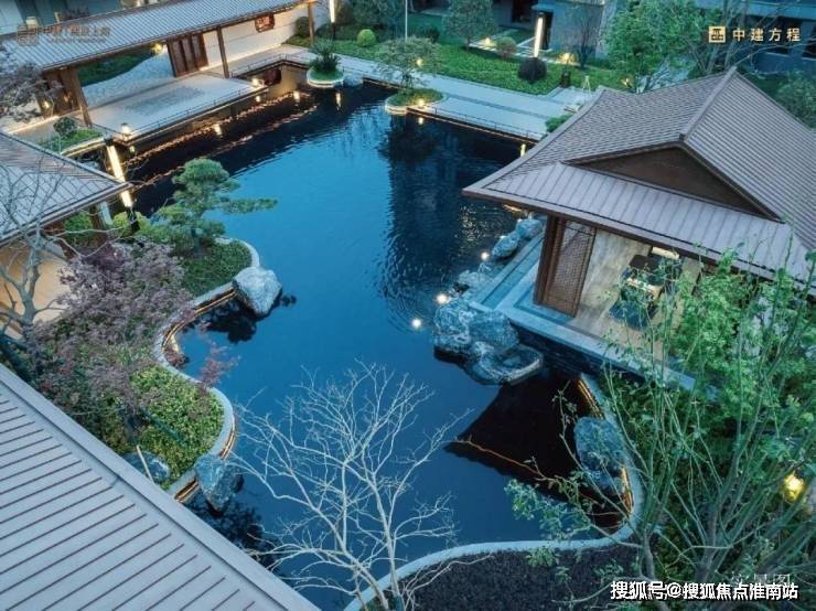 取法留园"移步换景"、拙政园"借景入园",以镜面水域为中心,诗画游廊围合,叠瀑流水潺潺。