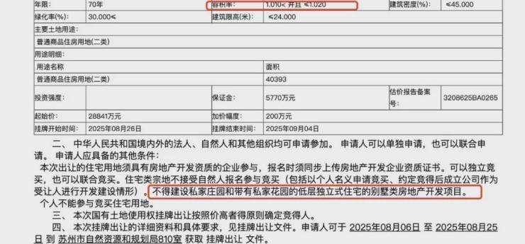 8月苏州挂牌的低密地块,出让要求明确规定