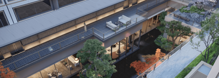 洋房选用灰金配色,光影落在大面玻璃上,配合金镂装饰层次叠进。叠墅的格栅来回“织”出鎏金纹路,琉璃拼成的屏风透着层叠绿意。联排的檐角裁开云影,平檐“裁云”的设计满是现代感,南北两侧相互呼应。