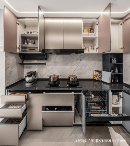 建发海宸巧妙利用空间拓展、功能分配、动线设置、超能收纳等实现了好厨房的“1步法则”,将操作步骤调配到舒适距离,让男女主人爱上下厨。