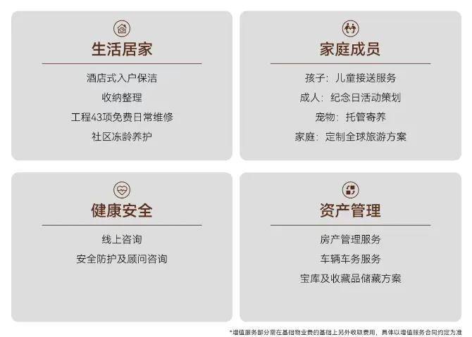 同时引入源自世界奢华酒店的“无边际服务”,依据280余项标准化服务细则,提供日常居家服务、健康安全、资产托管等增值服务,如入户保洁、儿童校车点接送、宠物托管、工程43项免费日常维修等,打造“冻龄”社区。