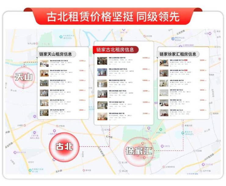 此外,古北高租售比提升性价比,如古北瑞仕花园165㎡月租超3万,高于天山、徐家汇。