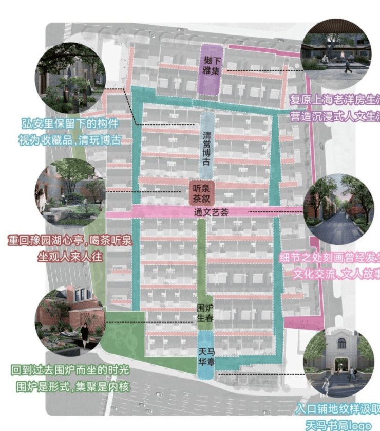 在社区的中轴上,弘安里植入记忆的符号与生活的画面,从入口处「天马华章」迈步前行,「围炉生春」「通文艺荟」「听泉茶叙」「清赏博古」贯穿到此次实景开放的「樾下雅集」,海派生活画卷昨日重现。