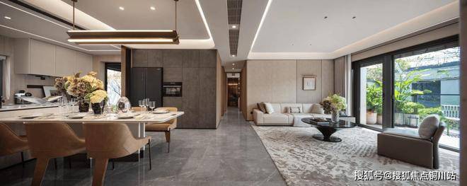 这一户型也是4房3卫,南向约33平空中庭院,偶数层是270都观景设计。南向五开间,双卧室都是套房设计,且都是独立衣帽间和明卫。北向约9米生活阳台,连接餐厨空间。