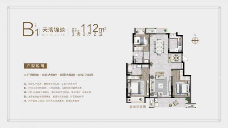 除了76㎡宝藏户型外,112㎡三房两厅两卫户型空间尺度、功能结构也是非常合宜的。