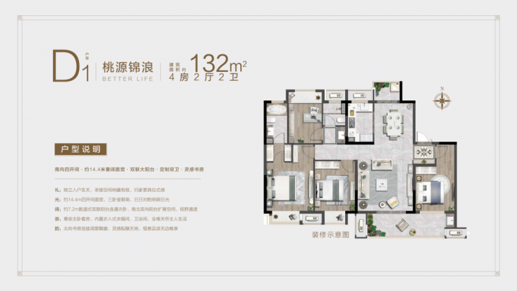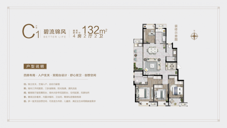 132㎡四房两厅两卫C户型与132㎡D户型,在空间布局上皆能满足二孩独立房间的需求。C户型最大的特点是双阳台设计,西向双联阳台连通餐客联厅、南向父母房一步花园阳台,非常适合老人居住。