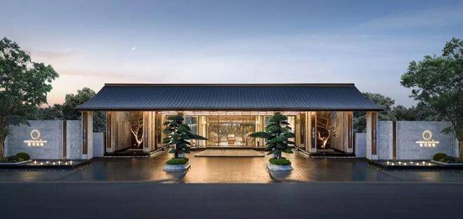 凤起冕旒|东方礼序的当代演绎;主入口门头以古代礼冠“冕旒”为灵感,采用现代设计语汇,构筑约85米“凤起冕旒”华贵门仪。景泰蓝垂幕「旒珠振玉」镶嵌其间,既呼应传统东方礼制,亦致敬苏州的时代封面与源点气质。门庭景观取罗汉松、朴树等珍稀树种,将奢石、水景与自然精巧融合,构筑一方承袭千年盛韵的尊荣之境。