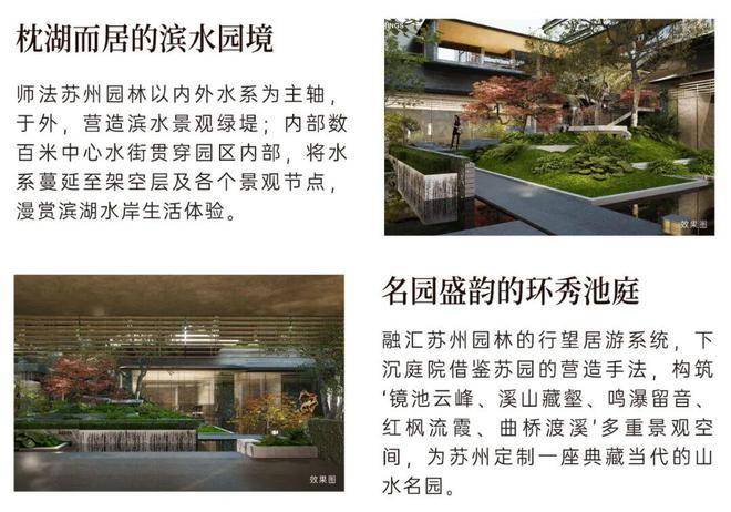 依凭半岛三面水岸的天然资源,以“一堤三面湖”和“水街襟两园”设计笔触,实现滨水互动、开门见水的场景体验;融汇吴门画派、苏州园林造园理念,营造出一座温润如玉的流动庭园。