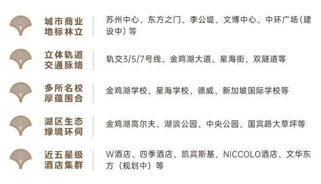 坐揽金鸡湖与独墅湖城市地标、商业旗舰、城市公园、五星级酒店、文化剧院等繁华盛景,苏州中心、东方之门、中环广场等地标配套环湖而立,奢享开放包容的国际滨水生活圈。