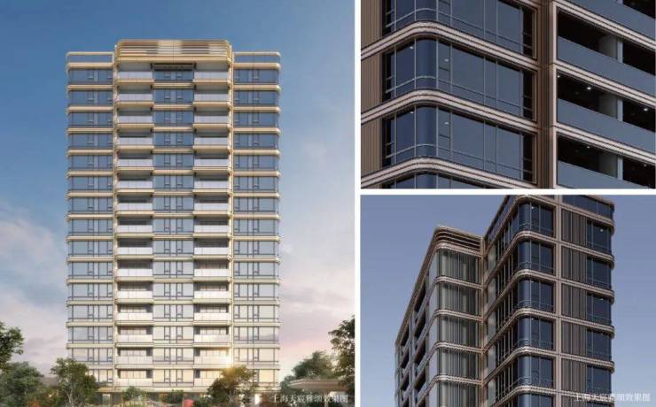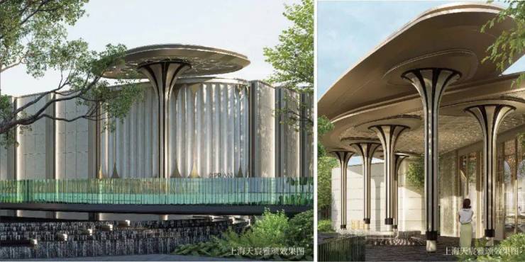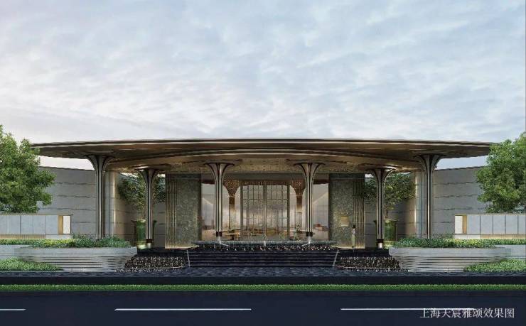 上海天宸雅颂的建筑外立面采用弧形铝板+大面积玻璃幕墙设计,打造柔和典雅的的建筑轮廓,并通过窄框线条与超流体美学工艺,形成精致细腻的视觉形象。