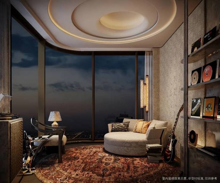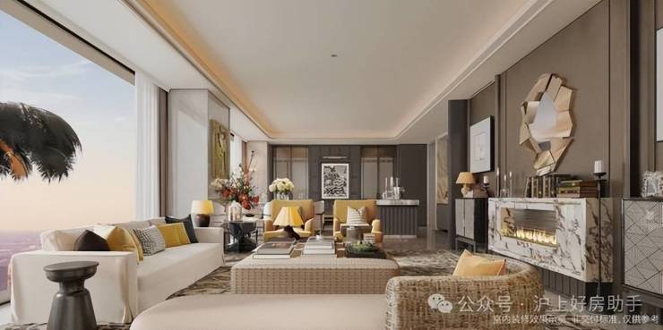 以270°三面环幕视野---南向约15米瞰江、东向纵览河园、北向拥揽世博园景,营造“阅尽千帆后的宁静”。