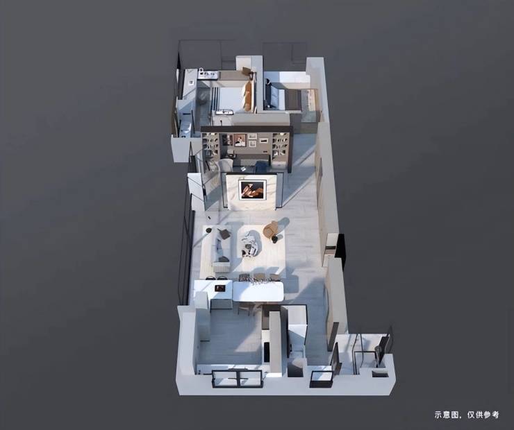南北贯通的端厅设计,整个户型南北长度接近16米,仅在中间有两个承重柱,端部无柱打造非常连续的景观面,整个客厅等于一个巨型的全景舱。