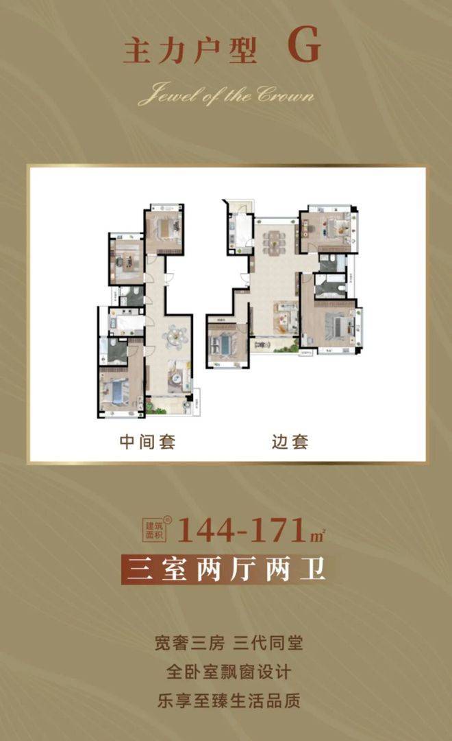 172㎡3房2厅3卫:横厅设计,7 米宽幕阳台,270° 转角飘窗,双主卧套房 + 独立家政间,终极改善天花板,仅18套。