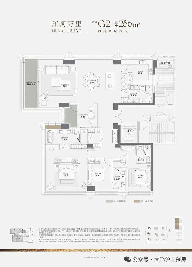 286㎡户型:三面瞰江设计,10米IMAX落地窗,三套房+独立家政间,主卧约40㎡带双衣帽间。
