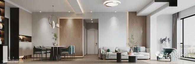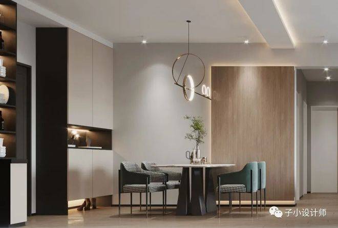 餐厅与客厅位置使用木饰面板材穿插出现,提升氛围感的同时,达到对房屋出现的洞口与过梁进行弱化效果,视觉上更具设计感。