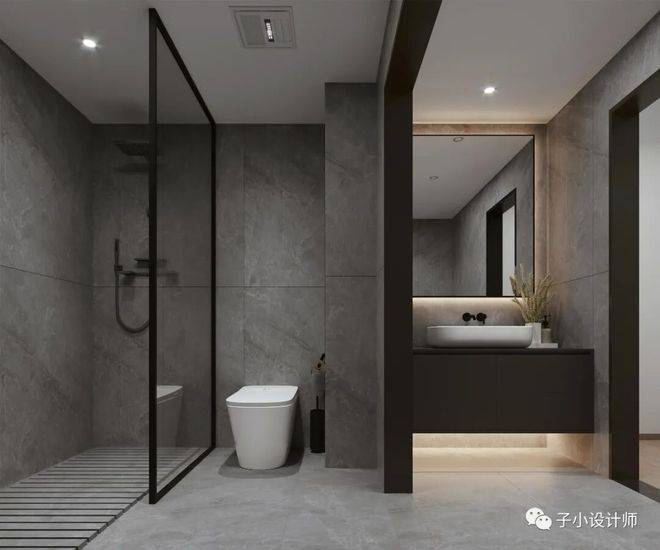 深黑色卫生间提升质感与品位,半隔断的淋浴间空间更大,完美实现“三分离”,多人使用互不干扰~