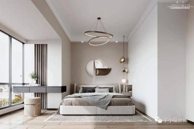 卧室的设计素雅温馨,使用大地色配色更加耐看,且由于色彩倾向弱,明度低,有助于睡眠休息~