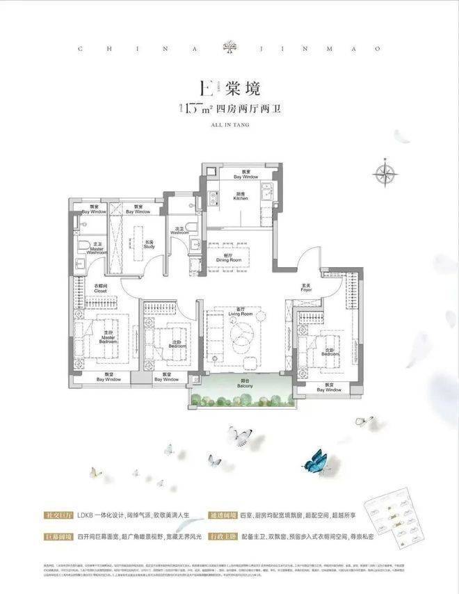 建面约117㎡3房2厅2卫,做到了3+1开间朝南5个飘窗+主卧套房设计+270°转角飘窗,所有的尺度都有进一步提升。