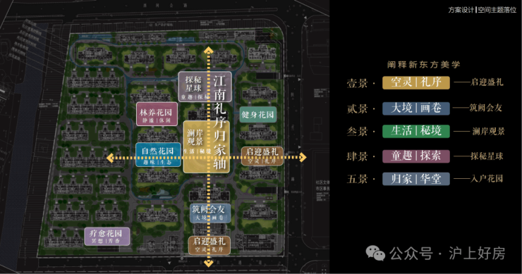 以江南人文精神为源点,打造两轴一环五进空间,江南礼序归家轴串联启迎盛礼、筑阙会友、归家华堂等5重礼制,尊崇归家;健康运动轴以24小时跑道为社区活力生活环,串联儿童乐园、长者康养、疗愈花园等10大生活场景,营造全龄全时的江南诗意生活