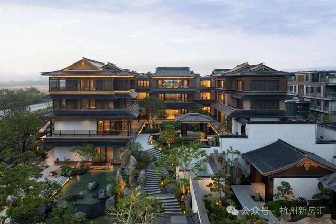建筑立面:古今交融的诗意表达:外立面以香槟金铝板为基调,搭配蓝眼睛石材与玻璃幕墙,融合传统歇山重檐、纳福悬鱼等元素,既保留宋式建筑的对称美学,又赋予现代建筑的轻盈通透。合院组团采用三面庭院设计,L型景观面与环绕式檐廊,将超山梅影、丁山湖光引入每一扇窗景!