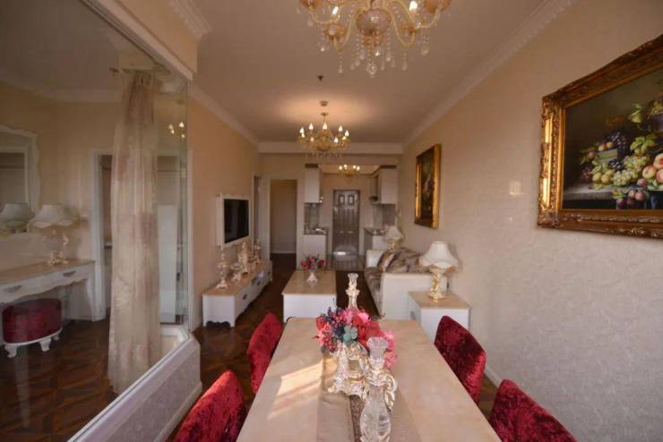 全套欧式家具、窗帘、水晶灯、科勒卫浴、康宝厨房设备。