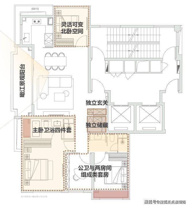 南向双卧室,主卧升级套房,可做双衣柜,门口次净衣区,连贯主卧卫生间,整墙衣柜最大化收纳可能性;另一间南卧与公卫,可组成类套房,早晚使用流线便捷;